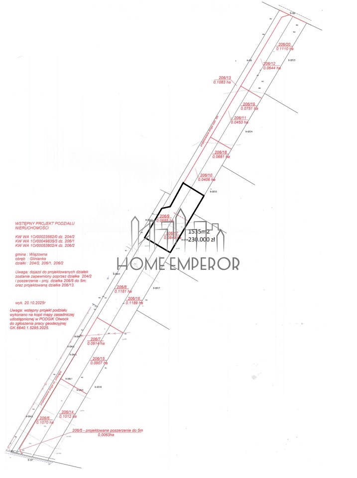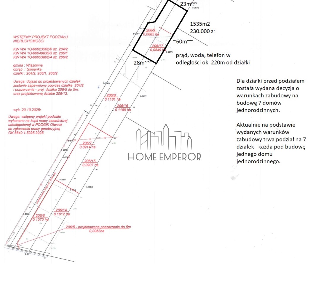Dla działek 206/1, 206/2, 204/2 zostały wydane warunki zabudowy na budowę 7 domów jednorodzinnych na podstawie których aktualnie geodeta dzieli działkę na 7 działek - każda pod budowę jednego domu jednorodzinnego. Szczegóły powierzchni są ujawnione na projekcie podziału, który jest załączony do tego ogłoszenia.