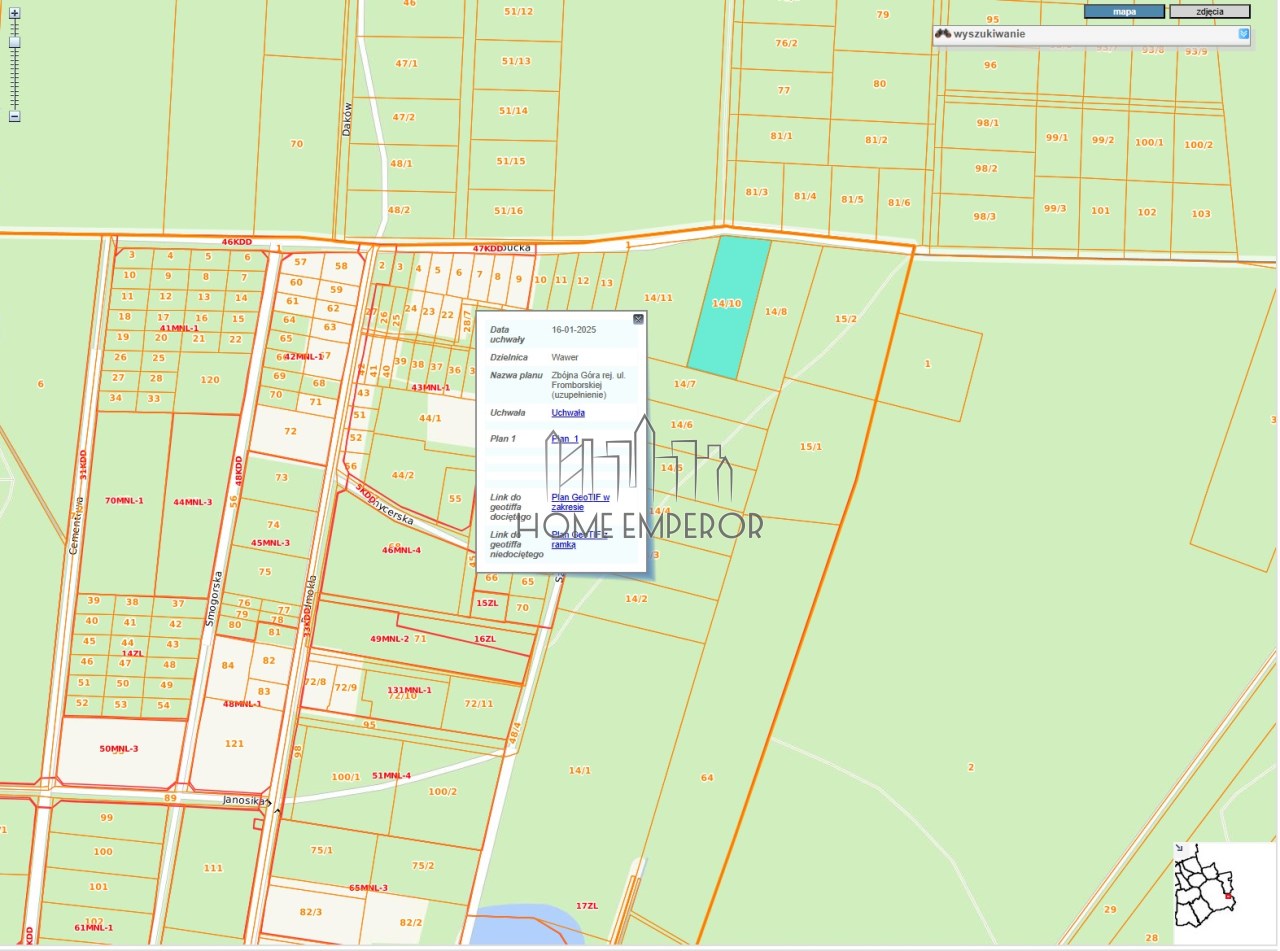 Teren objęty miejscowym planem zagospodarowania przestrzennego z symbolem 17 ZL czyli las. Nie ma możliwości zabudowy, działka do wykorzystania rekreacyjnego lub jako długoterminowa inwestycja.