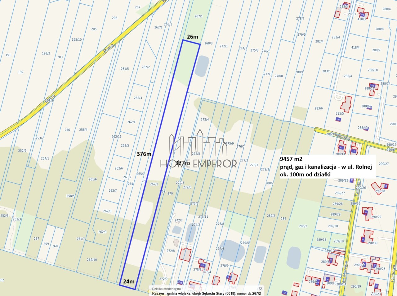 Prąd, gaz i kanalizacja - w ul. Rolnej około 100m od działki