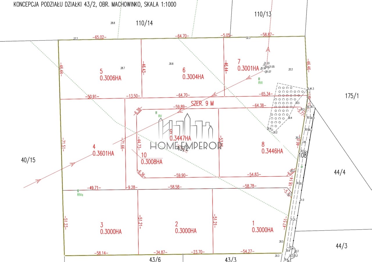 Na sprzedaż 9 działek o powierzchni 3001-3600mkw, które powstaną z podziału działki 43/2. Wstępny projekt podziału w galerii zdjęć.